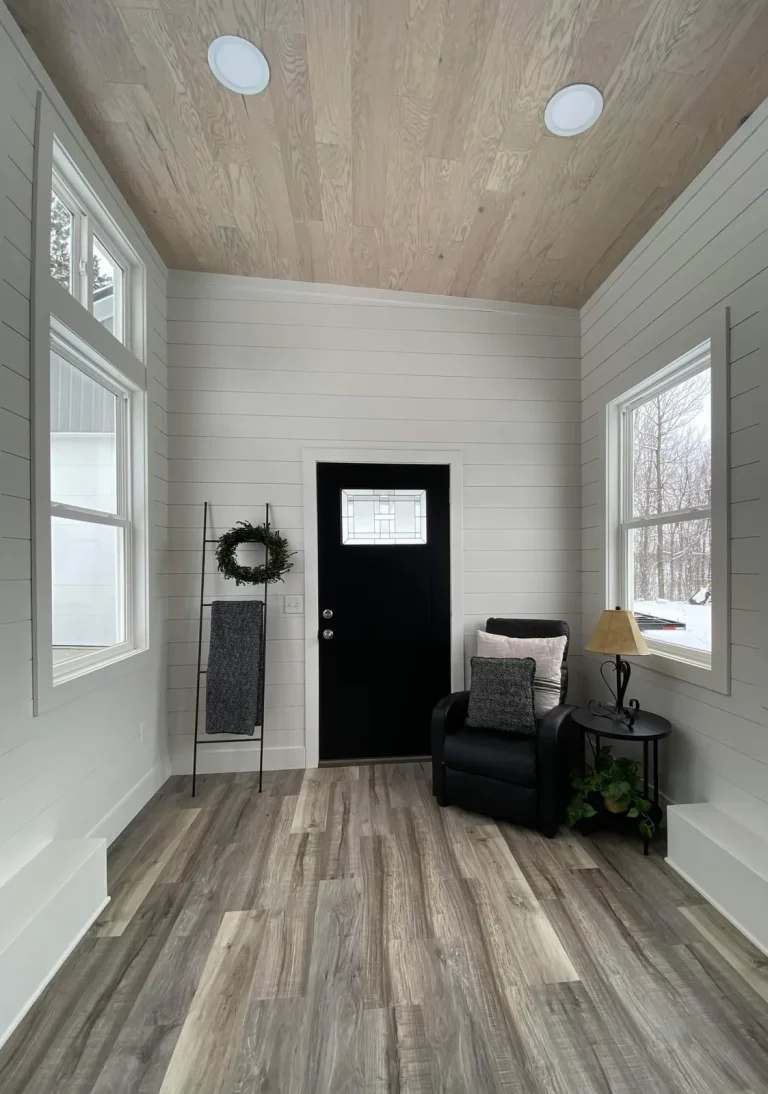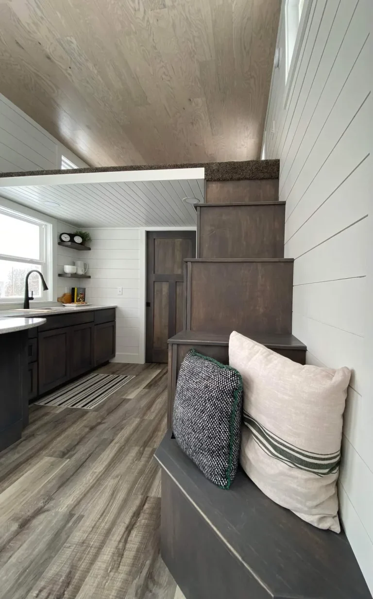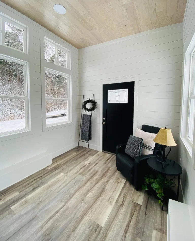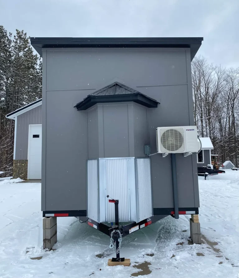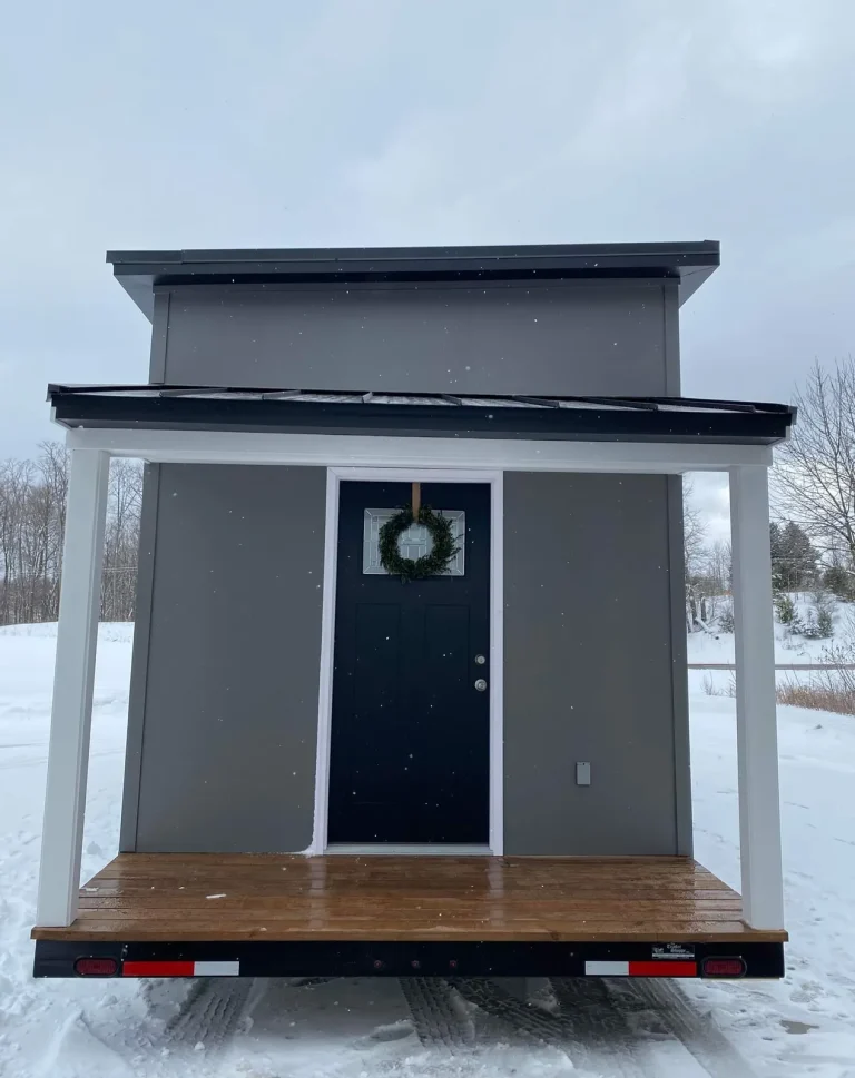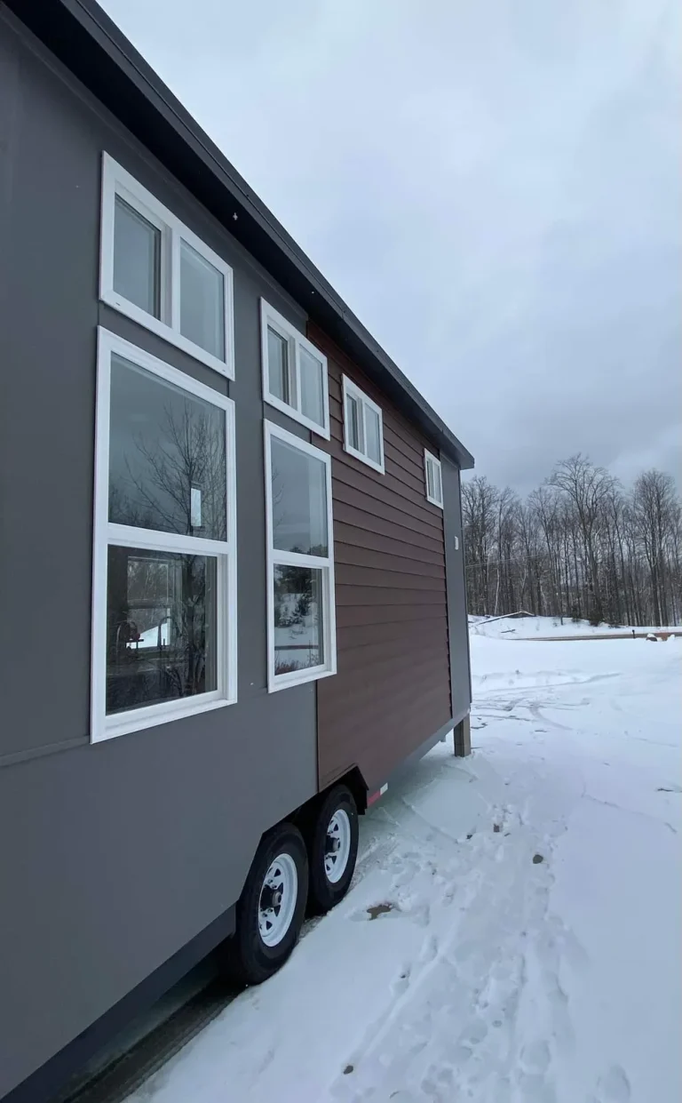 Our client wanted a cool, modern look for the exterior of this tiny house. We used multiple sidings to add some visual interest with the woodgrain accenting the gray SmartSide siding nicely. The white trim a windows along with the jet-black roof finished out the look very nicely.