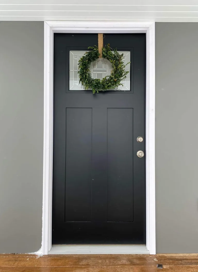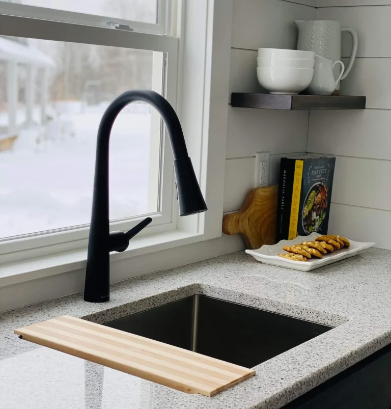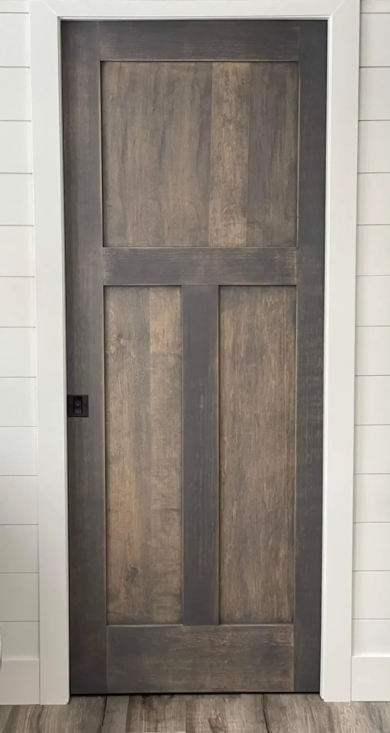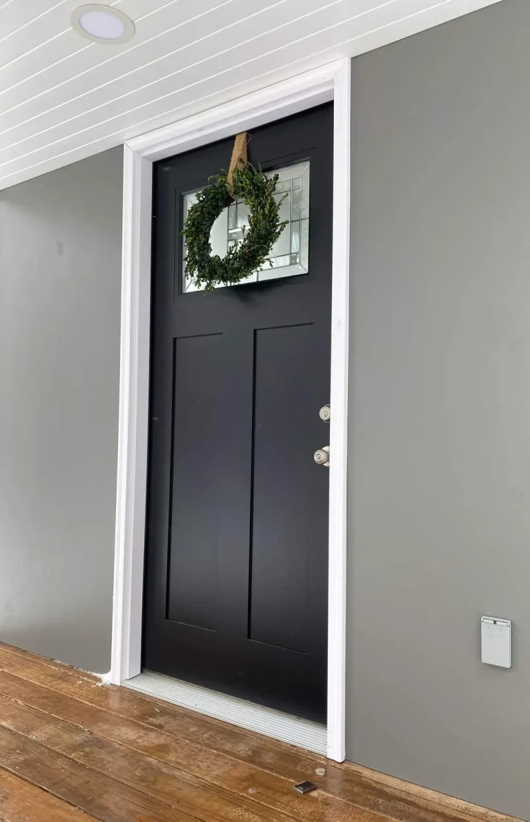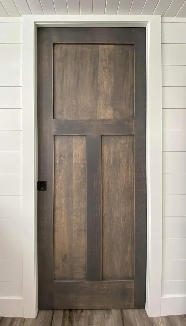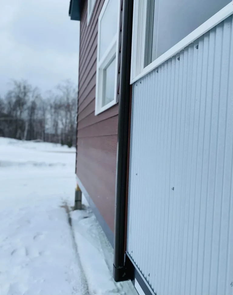 Our client wanted a cool, modern look for the exterior of this tiny house. We used multiple sidings to add some visual interest with the woodgrain accenting the gray SmartSide siding nicely. The white trim a windows along with the jet-black roof finished out the look very nicely.